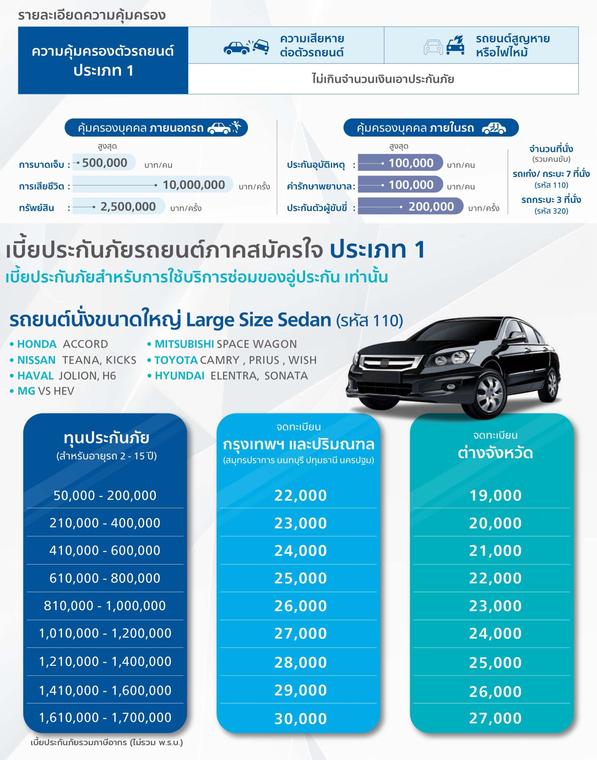 - เจ้าของรถยนต์นั่งขนาดใหญ่ (Large Sedan) ที่ต้องการความคุ้มครองสูงสุด