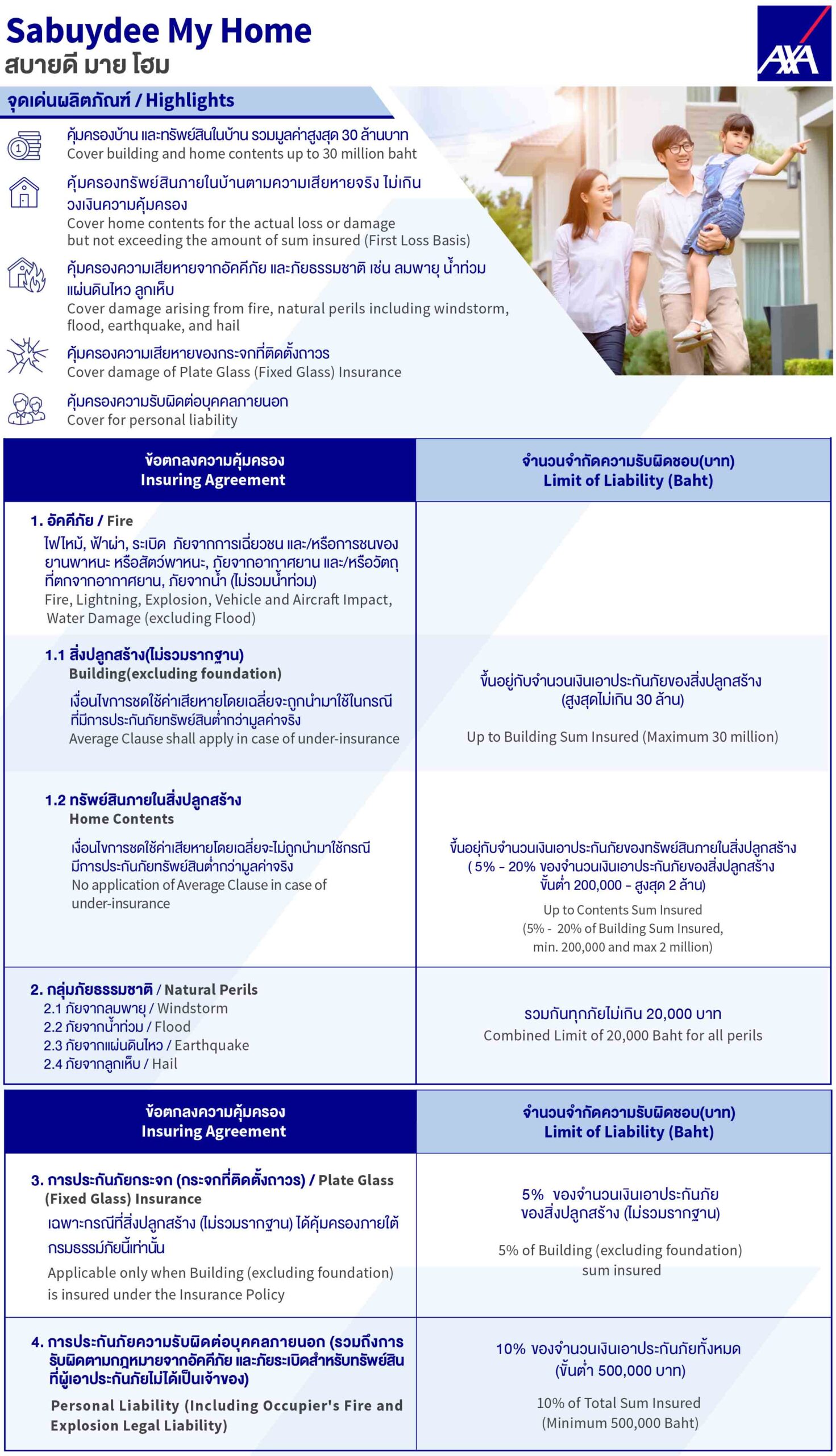 ประกันภัย “สบายดี มาย โฮม” จากแอกซ่าประกันภัยออกแบบมาเพื่อคุ้มครองบ้านและคอนโดมิเนียม ช่วยสร้างความอุ่นใจให้กับผู้พักอาศัยทั้งเจ้าของบ้านและผู้เช่า พร้อมดูแลบ้าน และคอนโดของคุณด้วย สบายดี มาย โฮม ประกันบ้าน และประกันคอนโดมิเนียม จากแอกซ่า ประกันภัย เราพร้อมให้ความคุ้มครองต่อความเสียหายต่อบ้าน รวมไปถึงกระจกที่ติดถาวรกับตัวบ้าน รวมถึงทรัพย์สินภายในบ้าน ตามความเสียหายที่เกิดขึ้นจริง (โดยไม่นำเงื่อนไขการเฉลี่ยความรับผิดมาใช้) ไม่ว่าจะที่เกิดขึ้นจากอัคคีภัย และภัยธรรมชาติ เช่น ลมพายุ, น้ำท่วม, แผ่นดินไหว และลูกเห็บ รวมถึงความคุ้มครองความรับผิดต่อบุคคลภายนอกอีกด้วย มั่นใจได้ว่าประกันภัยบ้านของเราไม่มีความรับผิดส่วนแรกแน่นอน โดยมีจุดเด่นที่น่าสนใจดังนี้: