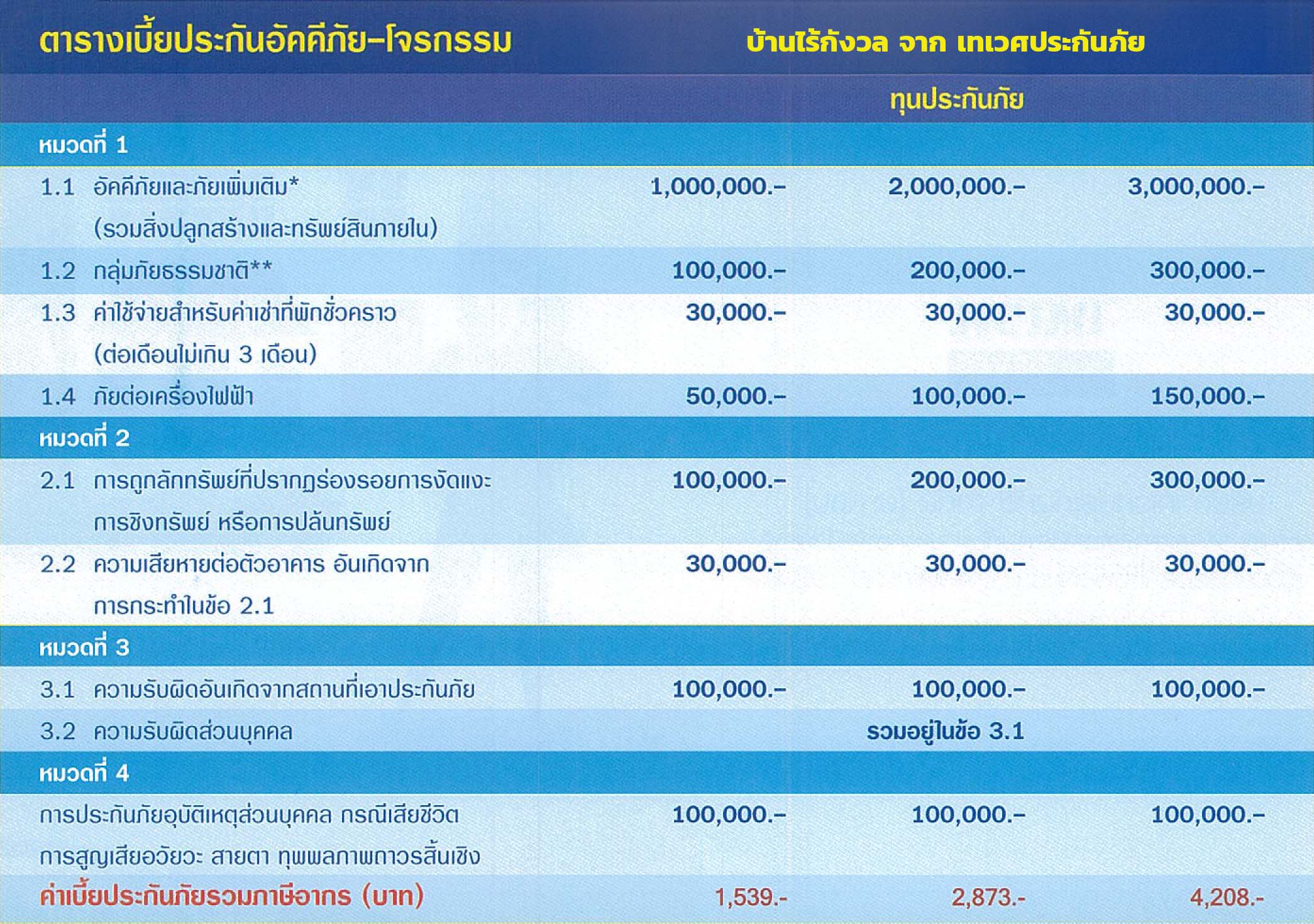 - เบี้ยประกันภัยนี้สามารถใช้ได้ทั้งบ้านอยู่อาศัย และคอนโดมิเนียมที่พักอาศัย
