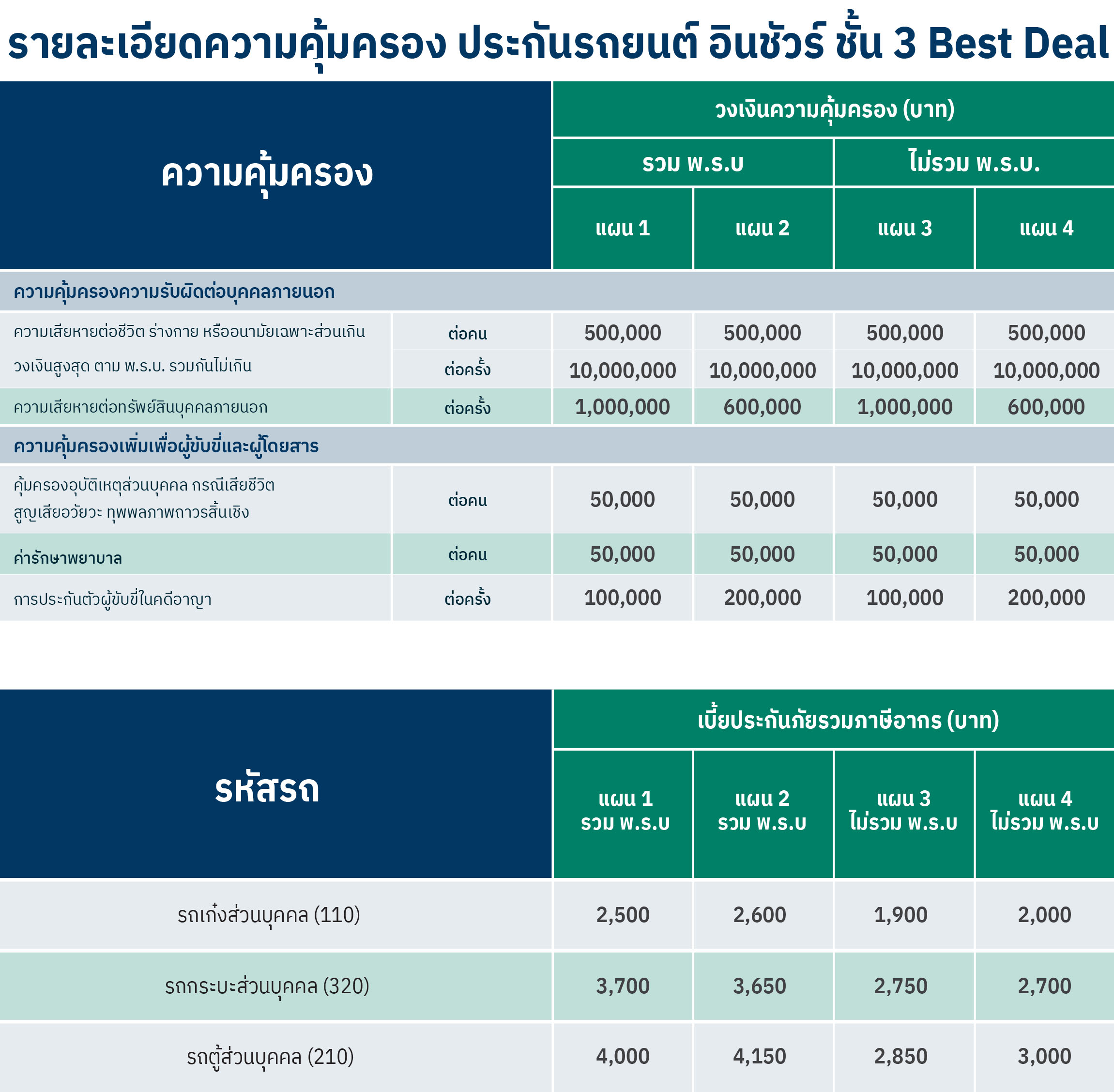 - ความคุ้มครองเพิ่มเพื่อผู้ขับขี่และผู้โดยสาร รถเก๋ง (110) = 5 คน, รถกระบะ (320) = 3 คน, รถตู้ (210)= 7 คน